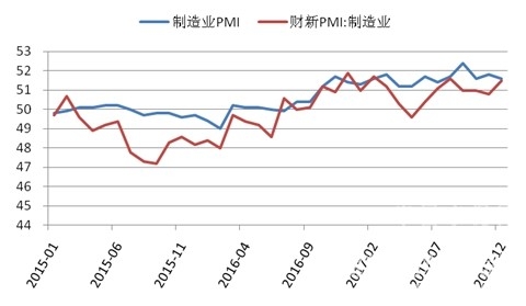 2016年以來,制造業景氣度保持波動上升的走勢,2017年,制造業PMI保持整體穩定,前三季度波動中略有上升但上漲幅度較2016年明顯放緩,第四個季度再現回落。官方統計數據顯示制造業連續17個月保持在擴張區間,而財新中國PMI在5月出現明顯下跌走勢,并且跌破榮枯分水嶺,顯示出制造業中小企業生產活動仍有較大波動。