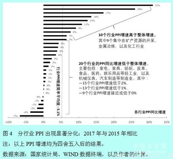 如果繼續比較2015年和2017年整體工業部門的利潤狀況,可以看到:與2015年全年相比,2017年全年整體工業部門的利潤總額增加了11633億元,其中僅僅前述9類上游行業(主要是去產能行業)就貢獻了8750億元,9類行業對利潤總額的增量貢獻了75%,而這些行業在2015年的總體利潤占比僅為19%。這是一個有趣的“二八現象”。在上述75%的貢獻當中,煤炭開采和洗選業、黑色金屬冶煉及壓延加工業、化學原料及化學制品制造業,三類行業對利潤增量的貢獻分別達到22個百分點、25個百分點、13個百分點。